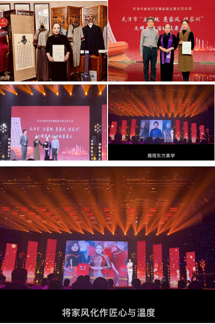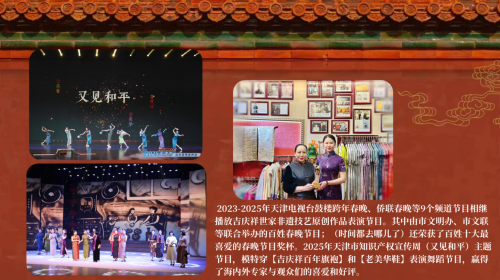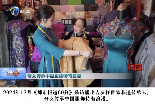 2023年至2025年,家族作品连续亮相天津电视台9个不同频道的春晚节目播放。其中,由天津市文明办主办、市文联等联合举办的2025春晚节目;《时间都去哪儿了》还荣获百姓最喜爱的春晚节目奖杯。这些展演不仅提升了品牌的知名度,更让传统技艺走进了千家万户。通过电视媒体,我们让更多普通人了解和喜爱旗袍文化,这是对我们传承工作的最大肯定吉庆祥说。
